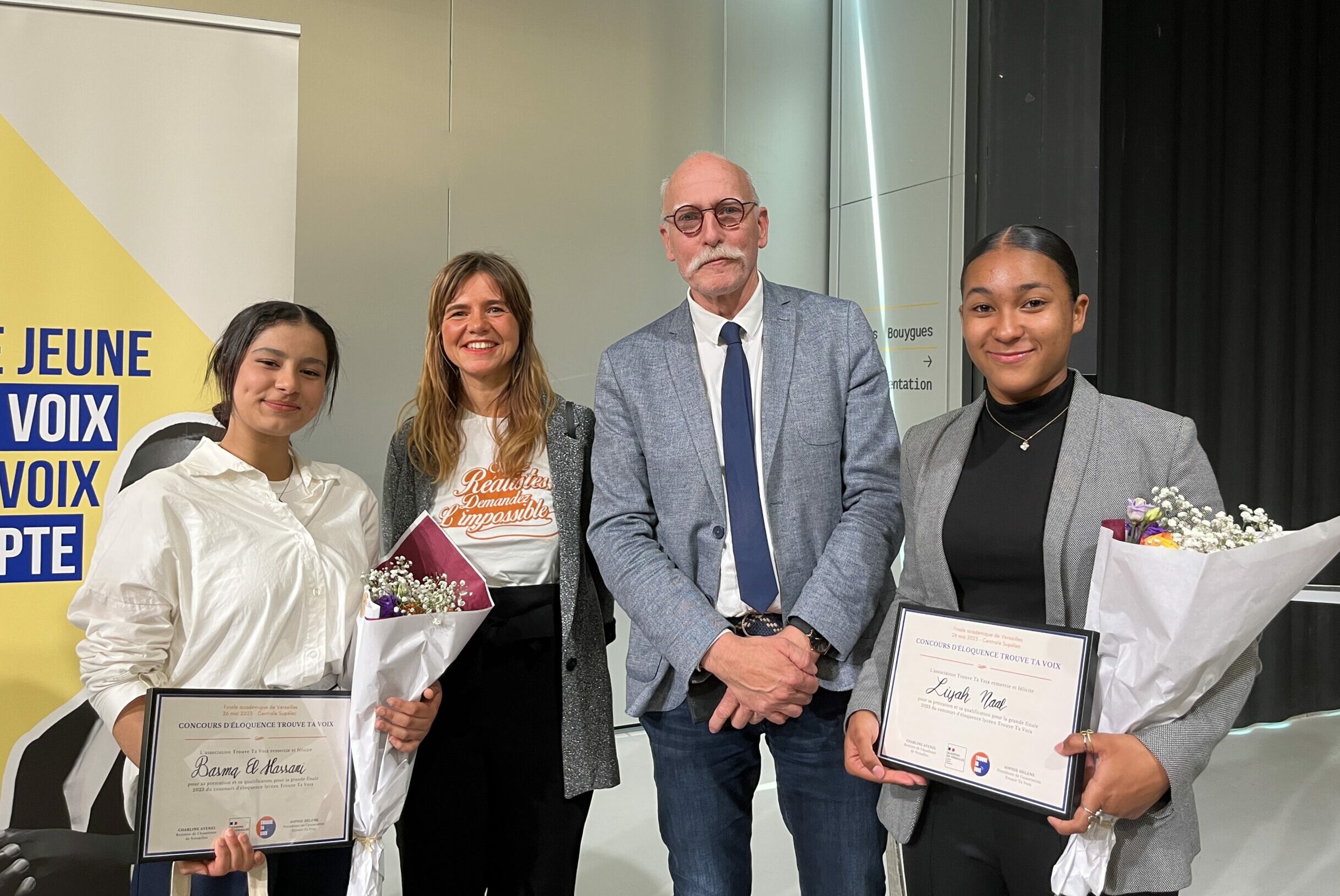 🌟 Le 26 mai dernier, nous écoutions les discours de nos jeunes lors de la finale académique de Versailles ! 🌟 Au cours de cette étape clef du concours Trouve Ta Voix, 10 finalistes ont répondu à la question suivante : “Peut-on vraiment se rencontrer ?” 🧐 Leurs discours ont été prononcés au-devant d’un jury d’exception, composé de Benoit Verschaeve, Secrétaire Général de l’Académie de Versailles ; Benjamin Mathieu, Grand Reporter chez Radio France et Fondateur du média Le Moment ; Younès Boucif, comédien et rappeur ; Marianne Vermot-Desroches, Responsable développement de Trouve Ta Voix et Marko Matijevic, élève du lycée Pablo Picasso (Fontenay-sous-Bois) et prix coup de cœur du concours Trouve Ta Voix 2022. 🗒 Un grand merci à eux, à Liam Borchardt pour la présentation et à Juliette Oudni pour sa performance de chant et de beatbox ! Toute l’équipe Trouve Ta Voix (Thomas Comtet, Sophie Helene, Marianne Vermot-Desroches, Laura Zebiche, Vincent Spirckel, Mathis Fenina, Juliette Oudni, Solène Klinge, Naïtcha LUZEIN, Théo CHENE, Anaïs